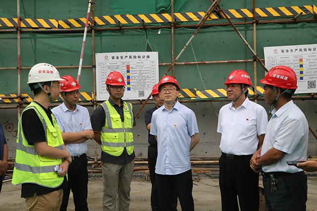 6月30日,济南市城乡交通运输局局长贾玉良一行察看集团承建的春暄路道路建设工程。集团总经理牟晓岩等陪同。
