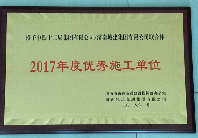 R3线土建五标济南城建/中铁十二局联合体项目部荣获济南轨道交通集团有限公司“优秀施工单位”荣誉称号