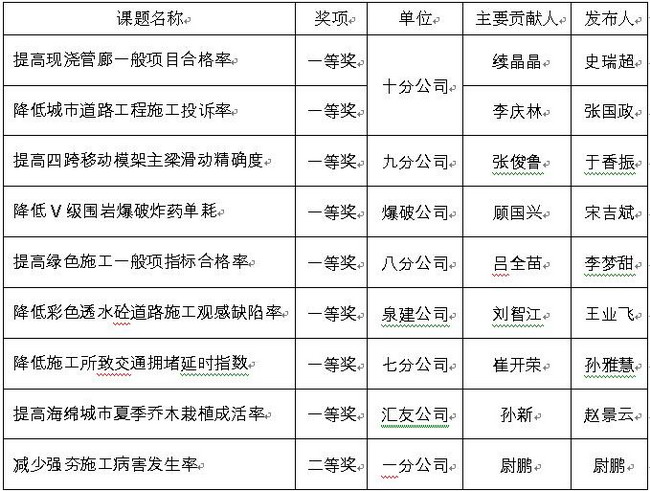 集团QC小组成果获奖名单