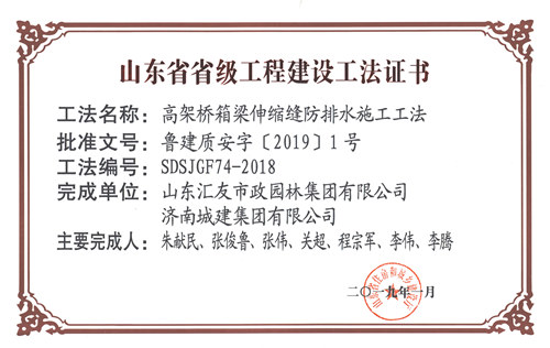 集团“高架桥箱梁伸缩缝防排水施工工法”被评为山东省省级工程建设工法