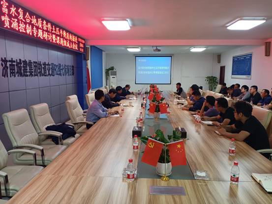 讲座结束后,与会人员针对济南地质特点和济南地铁施工难点召开了富水复合地质条件土压平衡盾构掘进喷涌控制专题研讨暨课题组成立会议。会议首先介绍了R2线二辛区间地质特点及掘进过程中遇到的喷涌情况,郑仔弟总工程师对喷涌控制方法进行了讲解,会议结合现场拌制的速泥效材料,讨论交流了该课题的问题解决思路及材料设备需求。最后进行课题组成立仪式,宣布课题组工作内容、成员分工职责等情况。