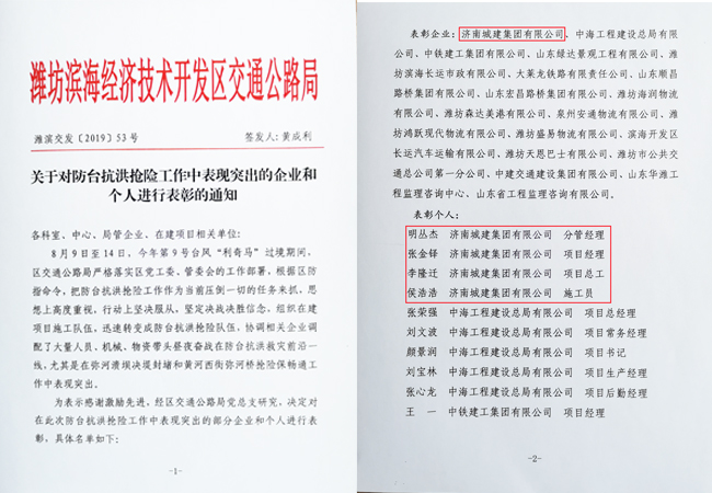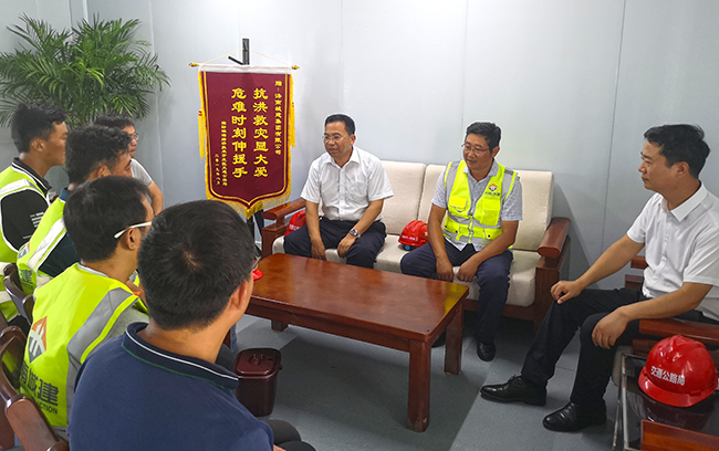 8月23日上午,潍坊滨海经济技术开发区交通公路局局长黄成利一行,为十分公司潍坊滨海经济技术开发区长江西街弥河桥改造工程项目部赠送“抗洪救灾显大爱,危难时刻伸援手”的锦旗,感谢济南城建集团长江西街弥河桥项目部在9号台风“利奇马”过境期间防台抗洪抢险工作中的突出表现。