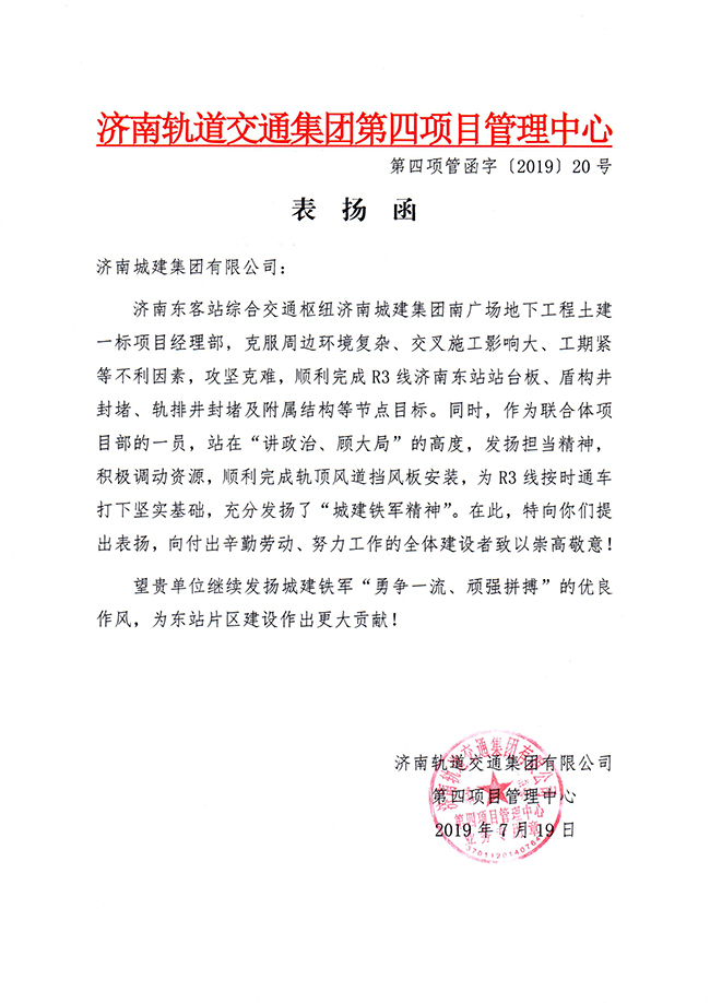 近日,济南轨道交通集团第四项管中心给集团发来表扬函,对集团承建的济南东客站综合交通枢纽南广场地下工程土建一标项目部提出表扬。集团东客站片区项目部将再接再厉,充分发扬城建铁军的优良作风,确保各项建设任务顺利完成。