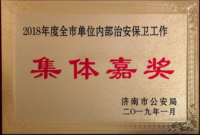2018年,集团认真贯彻落实习近平总书记有关安全生产和和谐稳定的指示精神,在集团领导的大力支持和全体职工的共同努力下,切实发挥安全保卫主体责任,不断强化内部治安管理,狠抓各项安全防范措施落实,积极排查及时消除安全隐患,严格防范不稳定因素,营造了安全和谐的生产秩序和工作环境,实现了集团安全形势持续平稳。集团荣获济南市公安局2018年度全市单位内部治安保卫工作“集体嘉奖”荣誉、爆破分公司荣获“集体三等功”荣誉、一分公司经理李江荣获“个人三等功”荣誉。