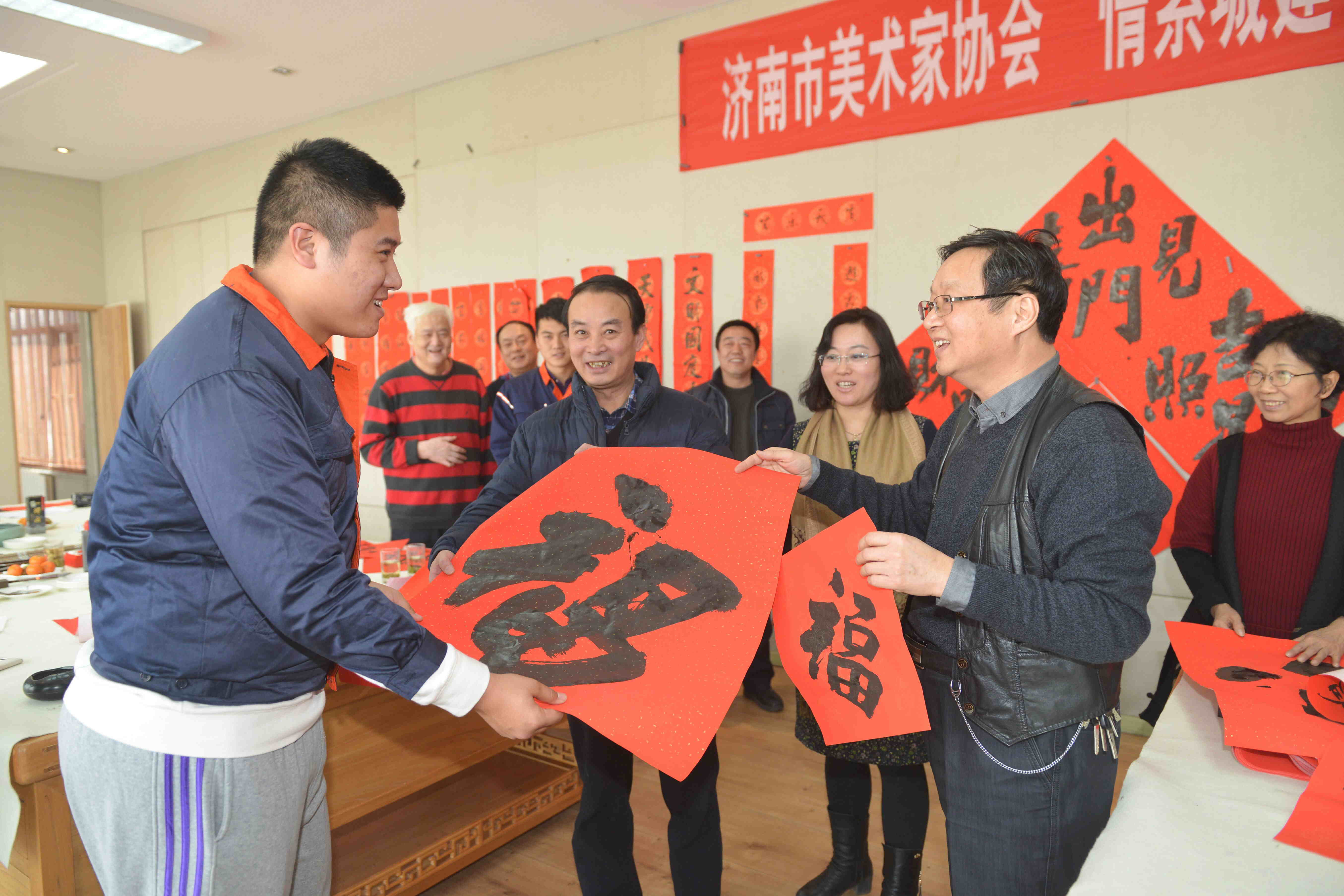 活动现场气氛欢乐祥和,书画家们带着对集团、对职工最真诚的祝愿挥毫泼墨,现场书写春联二百余幅,福字三百余张,满满的祝福溢于纸上。书写完毕,韦辛夷主席与汤继沂董事长亲自将一幅幅春联送到一线职工手中。捧着火红的春联,感受着领导的关怀,职工脸上洋溢着幸福的笑容。
