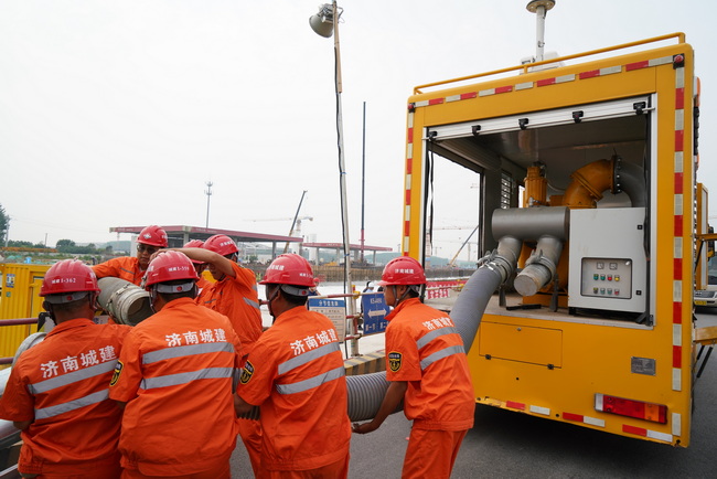 此次演练模拟济南市起步区黄河大道连日来普降大到暴雨,黄河大道一期工程三标段周边水位迅速上涨,已基本与基坑围堰持平,严重危及作业人员和设备安全的场景。防汛演练共进行了疏通两侧排水沟、沙袋围堰、临时用电、水泵排水、人员疏散、交通封闭、医疗救护、汛中上报、汛后回复、调拨新型排水车排水等10个科目的内容,演练参与人员100余人。