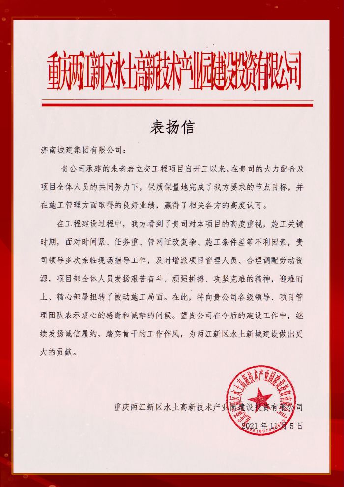 近日,重庆两江新区水土高新技术产业园建设投资有限公司向集团发来《表扬信》,对集团承建的朱老岩立交工程保质保量完成了业主方要求的重要节点目标给予充分肯定。