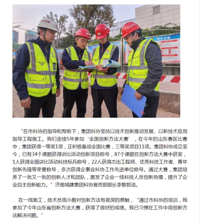 济南日报深入施工一线进行采访,了解到在施工过程中工艺的改进和创新给企业带来的效益,以及集团近几年取得的科技创新成就,对集团的创新发展情况和科协工作给予了高度评价。在今后的工作中,集团科协将继续激发广大科技人员的创新热情,打造“科创城建”。