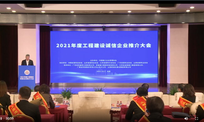 12月1日,中国施工企业管理协会2021年工程建设诚信企业推介大会以视频会议形式在北京召开,济南等地设立分会场。会议对荣获2021年度工程建设领域诚信荣誉的企业及个人进行了表彰。
