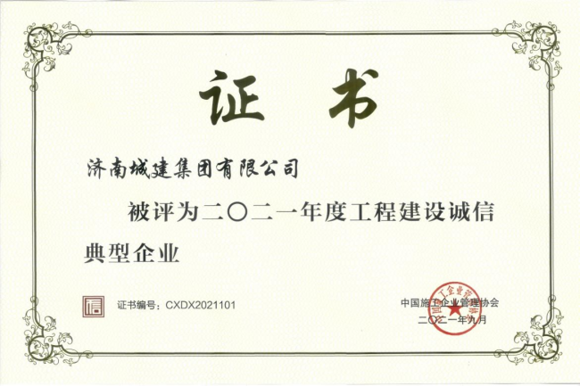 集团荣获“2021年度工程建设诚信典型企业”,集团及子公司山东汇通建设集团均被复评为“工程建设AAA级信用企业”。集团党委书记、董事长、总经理牟晓岩同志荣获“2021年度工程建设诚信企业家”称号。