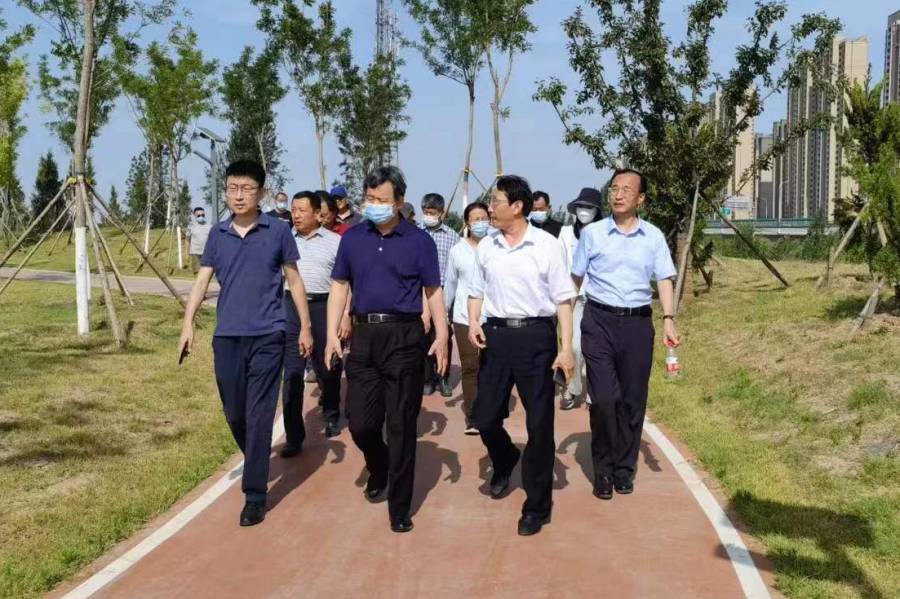 6月7日,济南市园林和林业绿化局党组书记、局长王国富察看集团园林公司承建的黄河淤背区郊野公园养护情况。