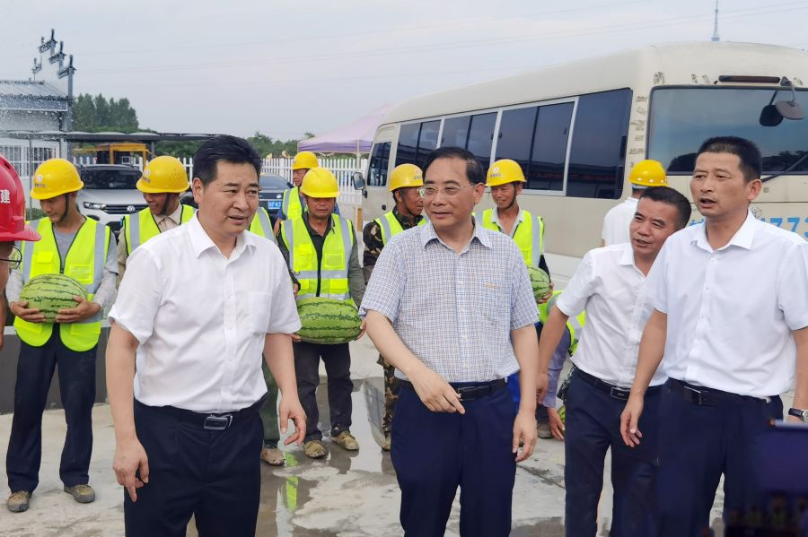 王普副市长来到施工现场,询问一线人员在高温天气下的工作及生活状况,感谢大家在项目建设中不畏酷暑、辛勤付出。他表示,项目部要坚持以人为本,采取有效防暑降温措施,切实保障员工人身安全和施工安全;希望广大建设者继续发扬战高温、保安全、建精品的精神,以更加良好的工作状态投入到施工中,推动工程取得新进展。
