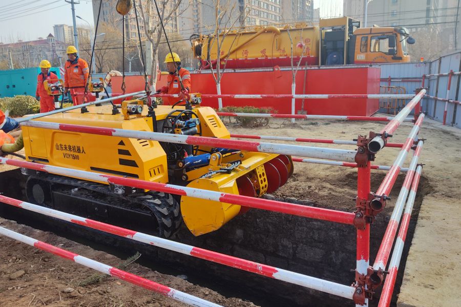 雨污分流改造是国家“十四五”城镇污水处理及资源化利用发展规划的重要内容,也是集团在城市基础设施建设领域的重点业务。集团在实施城市雨污分流改造工程中,积极开展科技创新,成功研发出水下无人清淤机器人,具备在特殊环境下代替人工进行城市河道、涵洞、暗渠等清淤作业的自动控制功能。技术人员远程遥控指挥,利用配有照明、摄像、水下成像声纳等观测设备的水下机器人实现水下作业,然后由清淤车辆把污泥运送至指定地点,完成整套清淤施工作业任务。相比于传统人工下水清淤作业,水下无人清淤机器人具有“人不下井、路不开挖、水不断流、泥不落地”技术优势,极大提升清淤效率,彻底消除人工清淤带来的安全隐患,助力城市精细化管理,提升城市水环境治理效能。