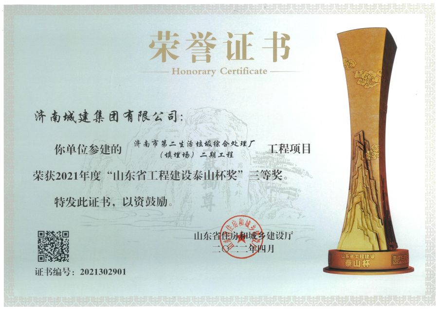 济南市第二生活垃圾综合处理厂(填埋场)二期工程项目荣获2021年度泰山杯三等奖