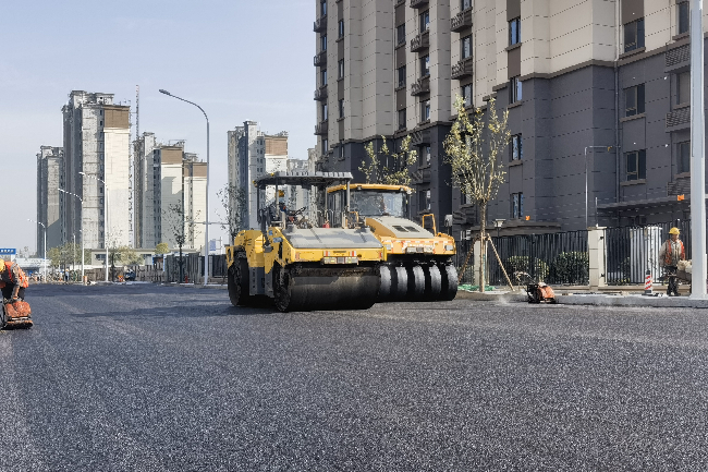 济南起步区总部经济产业园区四期安置东区项目完成保交房区域沥青面层摊铺作业